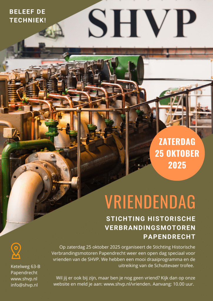 Op zaterdag 25 oktober 2025 organiseert de Stichting Historische Verbrandingsmotoren Papendrecht weer een open dag speciaal voor vrienden van de SHVP. We hebben een mooi draaiprogramma en de uitreiking van de Schuttevaer trofee. Aanvang: 10.00 uur. Wil jij er ook bij zijn, maar ben je nog geen vriend? Kijk dan op onze website en meld […]
